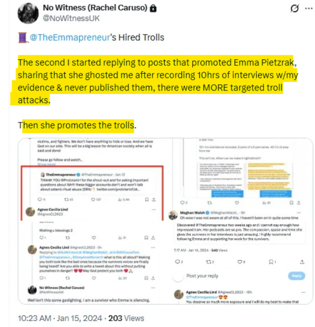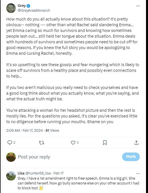 According to David, he knows the reason why Emma stopped doing interviews with Rachel. It appears that Emma told him sensitive information about Rachel. Why did Emma not explain to Rachel why she suddenly wanted to stop doing interviews? Surely a person deserves an explanation of why they were no longer going forward with interviews but instead Emma ghosted her, a known technique of hers. Just as Emma had to drop her slogan “Safe Space for all Survivors” that she quite obviously does not live up to, she is not the voice for some voiceless people, despite her “Voice for the Voiceless” marketing.