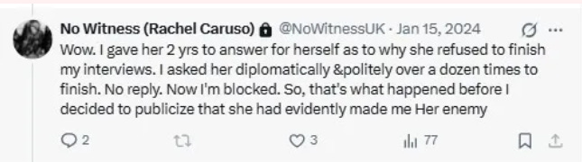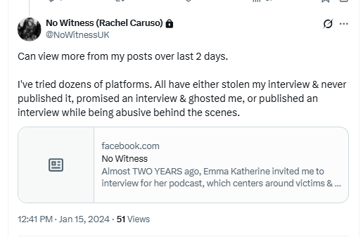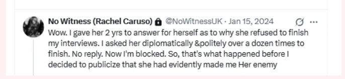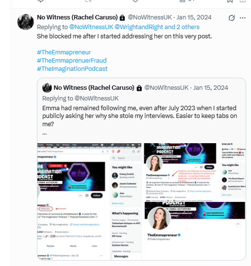In that post Rachel repeated that she had asked Emma a dozen times over 2 years for the reasons why she suddenly stopped with the interviews. It appears that despite ghosting her, Emma kept following Rachel, but then blocked her during this January 2024 conversation.