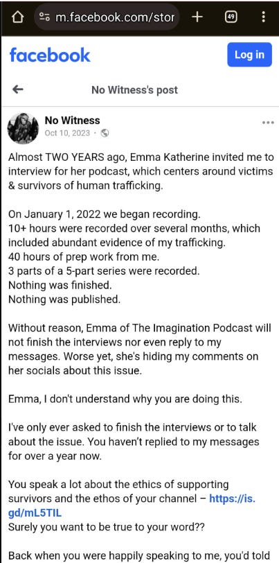 Rachel had said more on facebook in which she said that herself and Emma had started recording on Jan 1 2022, recorded for several months, and Rachel had spent 40 hours in preparation as well as the interview time. Emma would not tell Rachel why she had suddenly stopped communication, but just ghosted Rachel and even hid her comments that she made on Emma’s threads.