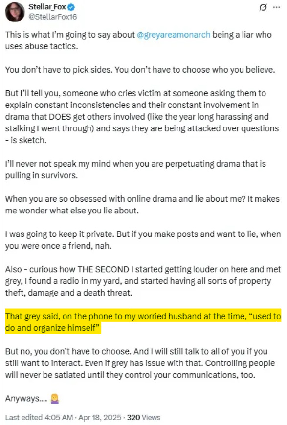 Rachel said that Emma was part of a group of perpetrators, who spent months and years infiltrating her life as part of a gang stalking operation. That very much fits the MO of Emma’s husband David aka Grey Area Monarch. He has used many sock puppets to gang stalk online and he has also admitted to Stellarfox16’s husband Aaron that he organised gang stalking and took part in gang stalking for the system.