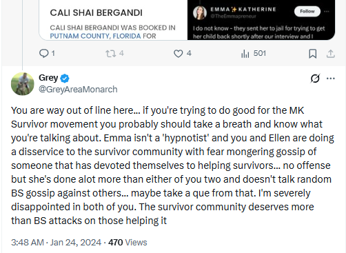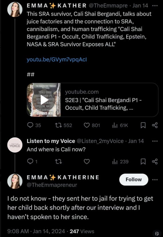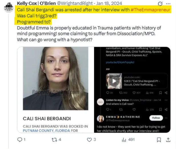 During the January 2024 discussions about Emma’s NLP, XKelly mentioned that Cali Shai Bergandi, had been imprisoned just days after Emma’s interview with her.