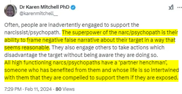 David intervened to attack people XKelly and Rachel and others when they were asking questions. It has been shown that he gang stalks, bullies, threatens, controls and manipulates people. His presence on social media is a danger to survivors and others. The way he acted to shut down legitimate questions about his wife /partner henchman’s use of NLP is doubly suspect. This is why partner henchmen relationships are so useful to those involved, and dangerous to others. They offer more than the sum of their parts to prop up each other’s credibility.