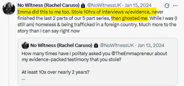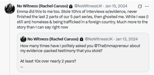 Rachel replied to XKelly and commented that she was a vulnerable trafficking victim who had spent 10 hours doing interviews with Emma. She had asked Emma about the interviews at least ten times over two years but that Emma had just ghosted her and the interviews had never aired. Rachel was also limited in what she would say due to her situation, as she was still being trafficked.