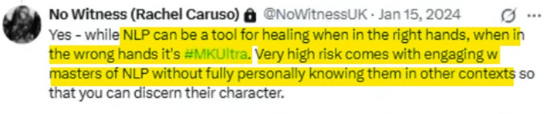 Rachel is a survivor, and she said that whilst NLP could be used as a tool for healing in the right hands, then in the wrong hands it was MK Ultra. She said there was a very high risk with engaging with masters of NLP without fully personally knowing them in other contexts.