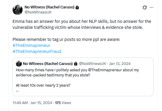 Although Emma answered XKelly about her NLP skills, albeit unsatisfactorily and misleadingly, Rachel received no answers from Emma, and referred to Emma as a fraud #TheEmmapreneurFraud.
