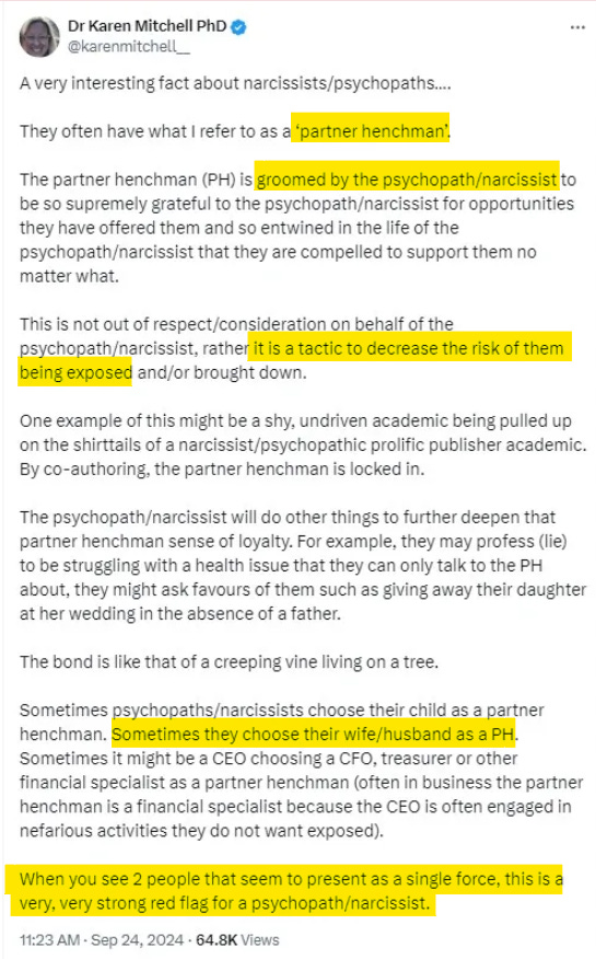 Although he is short of a chief flying monkey, David still has his partner henchman / wife Emma of course. However that is a different type of role, a deeper cover for him. The partner henchman role is described by Dr. Karen Mitchell.