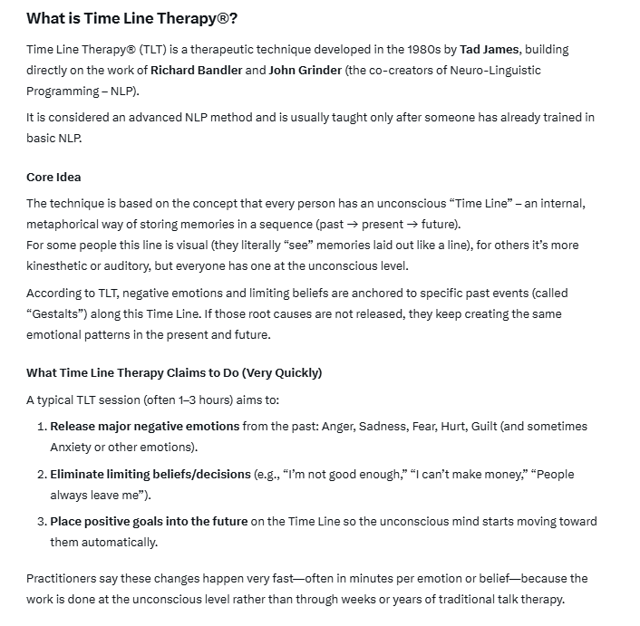 Time Line Therapy™: A NLP-derived therapeutic process that uses a person’s internal “time line” (how they unconsciously store memories) to release negative emotions, limiting decisions, and create a compelling future, [g].