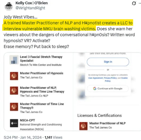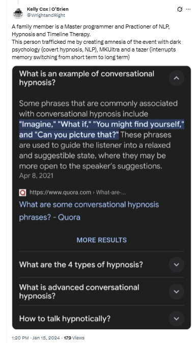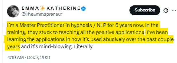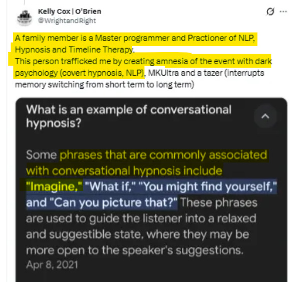 The next month in January 2024 Kelly Cox O’Brien’s account WrightandRight seems to have been the first to raise Emma’s NLP and the potential for misuse of such a technique.