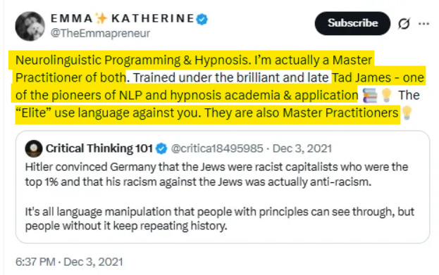 Text - “Neurolinguistic Programming & Hypnosis. I’m actually a Master Practitioner of both. Trained under the brilliant and late Tad James - one of the pioneers of NLP and hypnosis academia & application. The “Elite” use language against you. They are also Master Practitioners”.