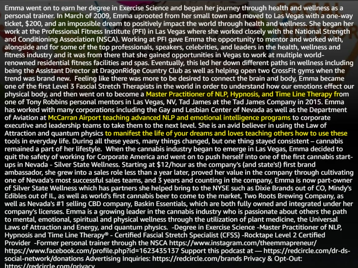 Emma went on to earn her degree in Exercise Science and began her journey through health and wellness as a personal trainer. In March of 2009, Emma uprooted from her small town and moved to Las Vegas with a one-way ticket, $200, and an impossible dream to positively impact the world through health and wellness. She began her work at the Professional Fitness Institute (PFI) in Las Vegas where she worked closely with the National Strength and Conditioning Association (NSCA). Working at PFI gave Emma the opportunity to mentor and worked with, alongside and for some of the top professionals, speakers, celebrities, and leaders in the health, wellness and fitness industry and it was from there that she gained opportunities in Vegas to work at multiple world-renowned residential fitness facilities and spas. Eventually, this led her down different paths in wellness including being the Assistant Director at DragonRidge Country Club as well as helping open two CrossFit gyms when the trend was brand new. Feeling like there was more to be desired to connect the brain and body, Emma became one of the first Level 3 Fascial Stretch Therapists in the world in order to understand how our emotions effect our physical body, and then went on to become a Master Practitioner of NLP, Hypnosis, and Time Line Therapy from one of Tony Robbins personal mentors in Las Vegas, NV, Tad James at the Tad James Company in 2015. Emma has worked with many corporations including the Gay and Lesbian Center of Nevada as well as the Department of Aviation at McCarran Airport teaching advanced NLP and emotional intelligence programs to corporate executive and leadership teams to take them to the next level. She is an avid believer in using the Law of Attraction and quantum physics to manifest the life of your dreams and loves teaching others how to use these tools in everyday life. During all these years, many things changed, but one thing stayed consistent – cannabis remained a part of her lifestyle. When the cannabis industry began to emerge in Las Vegas, Emma decided to quit the safety of working for Corporate America and went on to push herself into one of the first cannabis start-ups in Nevada - Silver State Wellness. Starting at $12/hour as the company’s (and state’s!) first brand ambassador, she grew into a sales role less than a year later, proved her value in the company through cultivating one of Nevada’s most successful sales teams, and 3 years and counting in the company, Emma is now part-owner of Silver State Wellness which has partners she helped bring to the NYSE such as Dixie Brands out of CO, Mindy’s Edibles out of IL, as well as world’s first cannabis beer to come to the market, Two Roots Brewing Company, as well as Nevada’s #1 selling CBD company, Baskin Essentials, which are both fully owned and integrated under her company’s licenses. Emma is a growing leader in the cannabis industry who is passionate about others the path to mental, emotional, spiritual and physical wellness through the utilization of plant medicine, the Universal Laws of Attraction and Energy, and quantum physics. -Degree in Exercise Science -Master Practitioner of NLP, Hypnosis and Time Line Therapy® - Certified Fascial Stretch Specialist (CFSS) -Rocktape Level 2 Certified Provider -Former personal trainer through the NSCA https://www.instagram.com/theemmapreneur/ https://www.facebook.com/profile.php?id=1623435137 Support this podcast at — https://redcircle.com/dr-ds-social-network/donations Advertising Inquiries: https://redcircle.com/brands Privacy & Opt-Out: https://redcircle.com/privacy