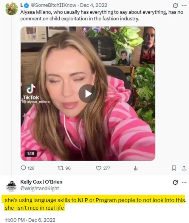Back in 2022, XKelly tweeted publicly about her concern that Alyssa Milano was using NLP to shut people down who were questioning her about her support of Balenciaga clothing, who had been exposed for their role in child abuse.