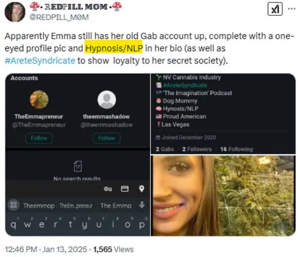 On social media site GAB, Emma described herself as 3 things. Dog Mommy, Hypnosis / NLP and Proud American and she joined in Dec 2020. That shows the importance to which she placed her NLP and hypnosis training. There is also a one eye photo there as well.