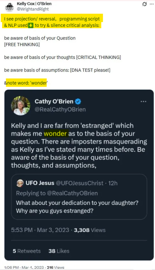 The background of this account, Kelly Cox O’Brien is that she claims to be the daughter of Cathy O’Brien, and that Social Security have verified her identity, although Cathy’s twitter account denies it. However it is not clear who is operating Cathy’s twitterX account, as it was admitted that Mikaela / Shaela set up the account and ran it when it started. Furthermore there are signs that Cathy may have been re-accessed and come under nefarious control since Mark Phillip’s death. I have written many posts on the situation, see the list at the end, and there are a few more to write when time permits. To avoid confusion I refer to the Kelly Cox on X as XKelly.