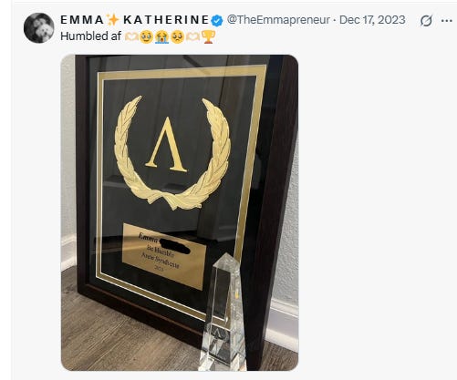 Emma received a “Be Humble” award from motivational company Arete Syndicate [1] in Dec 2023, which she tweeted about.
