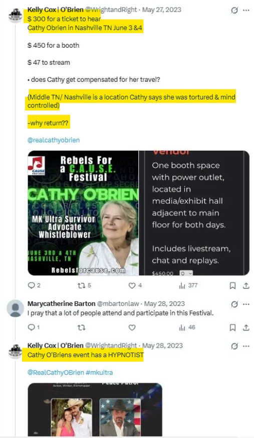 XKelly draws attention to the money being made from these events and that they are at locations where Cathy has been previously tortured and programmed with mind control.