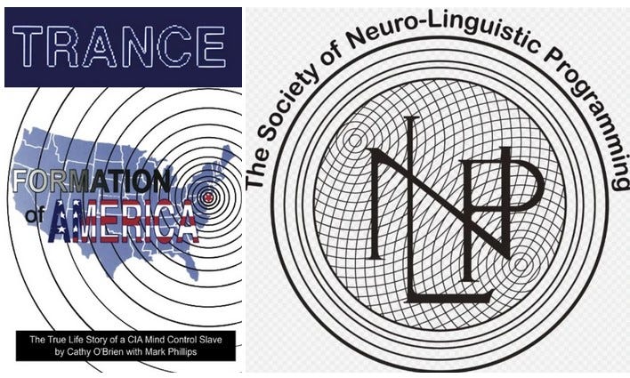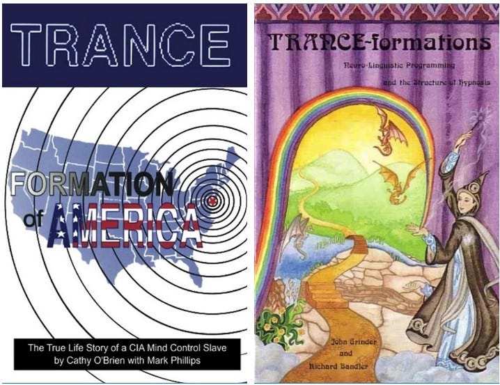 There are some odd similarities. Cathy’s first book was called TRANCE Formation of America. Richard Bandler, the founder of the NLP approach to psychotherapy, wrote a book on NLP called TRANCE-formations, which had all sorts of mind control and cult symbolism, The Magikal Connections to TRANCE Formation [COB4]. Both have capitalised the TRANCE.