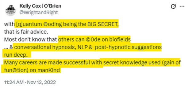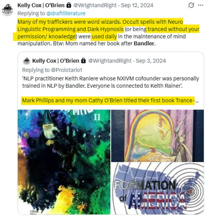 This tweet by XKelly was much later, however it makes sense to start with the similarities between Bandler and Cathy. XKelly stated that her own traffickers were word wizards, and used occult spells with NLP.