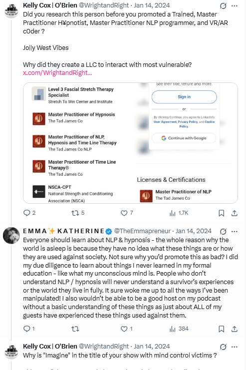 In January 2024, Kelly then drew attention publicly to the fact that Emma from the Imagination Podcast was a Master Practitioner of NLP and of Hypnosis. XKelly also questioned whether she might be a VR/AR (virtual reality / augmented reality) coder. She also questioned the formation of a limited liability company, LLC by Emma.