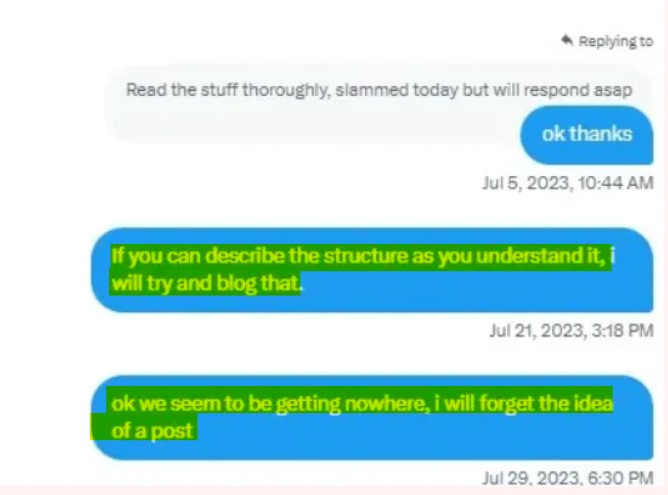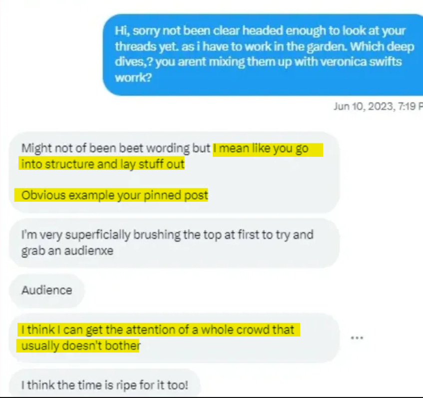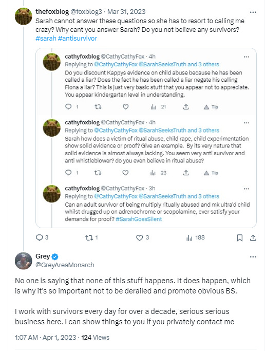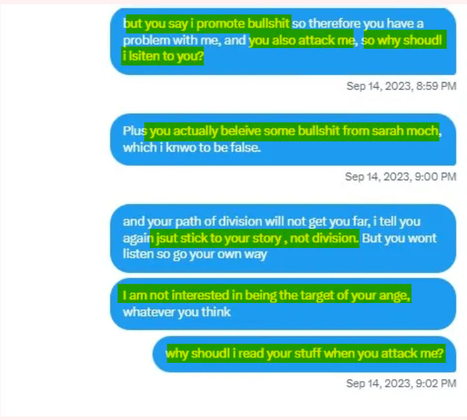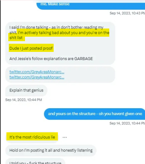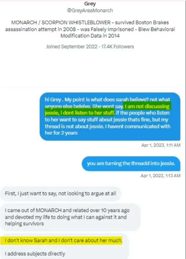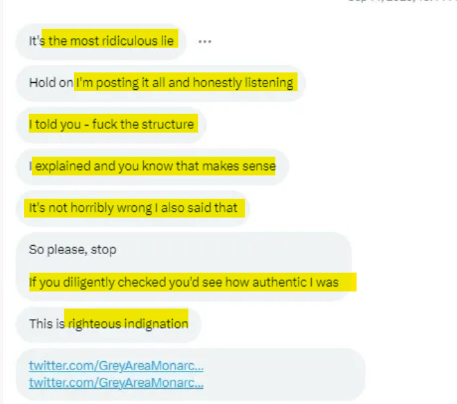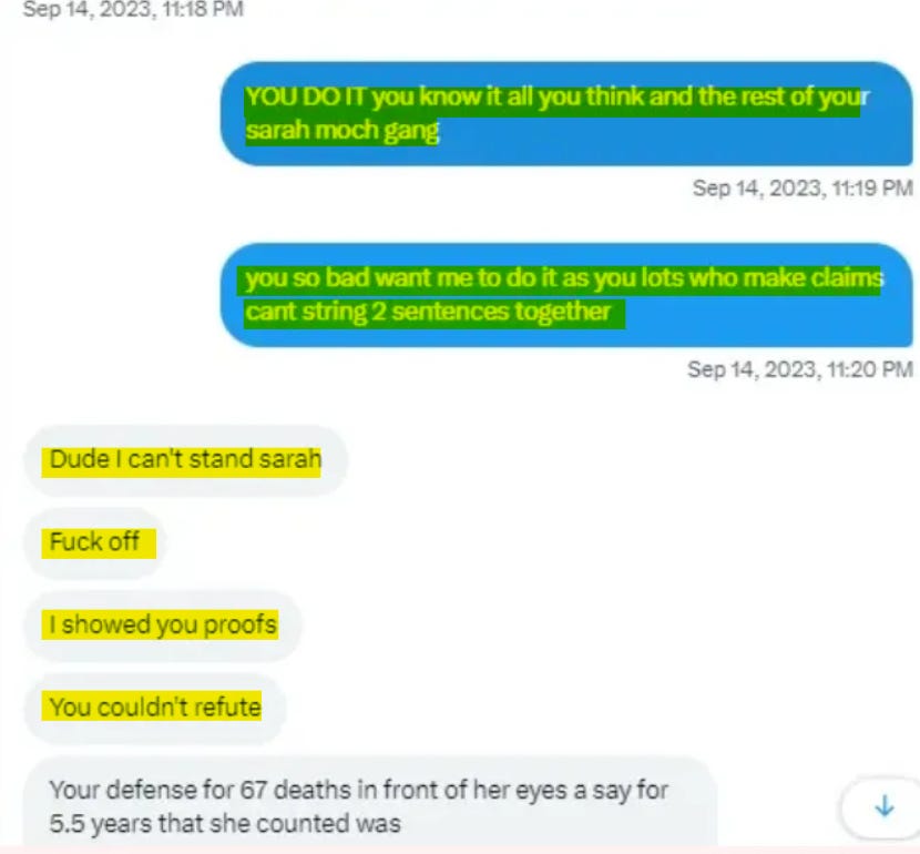David said that he did not know anything from Sarah Moch and called me a “fucking idiot”. I knew he was lying, as he spouted the talking points from their group. I had seen enough of Sarah Moch’s rantings to recognise them. Many months later I found out how much they had been in contact, and that Sarah Moch and Paula Blades were amongst the first people that David had contacted when he came on twitter in late 2022, using the Grey Area Monarch persona, [SSGM38] [SSGM43].