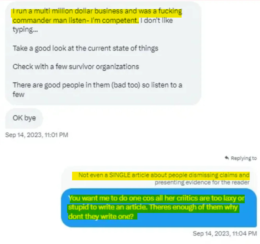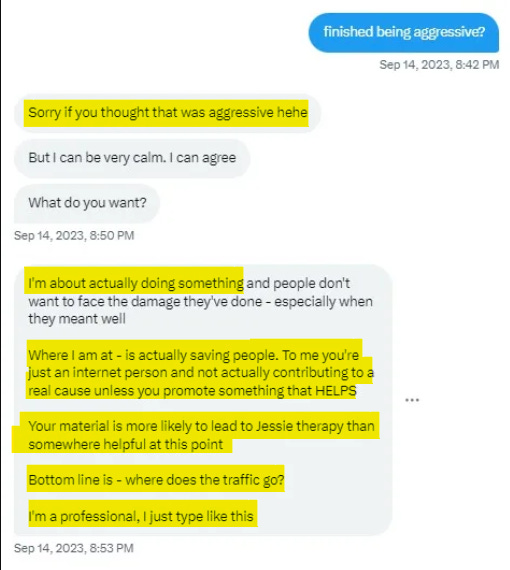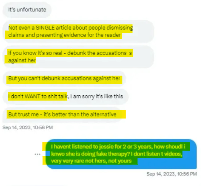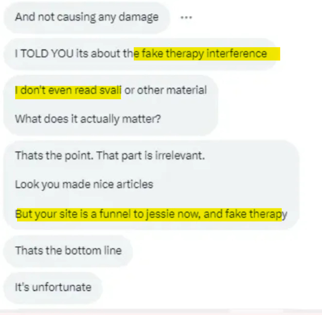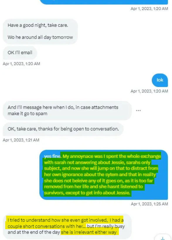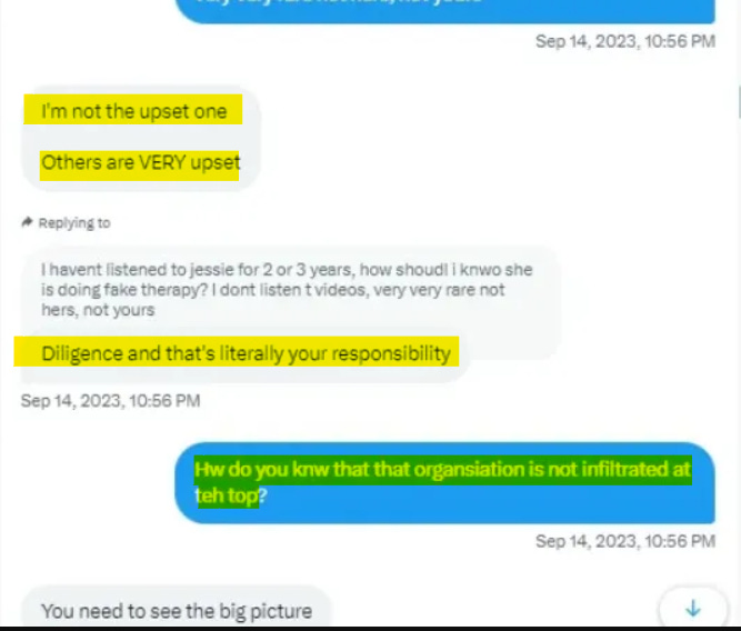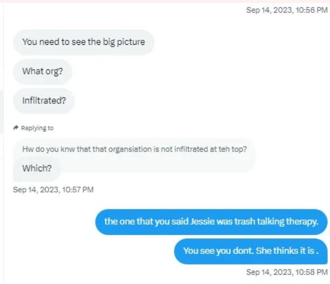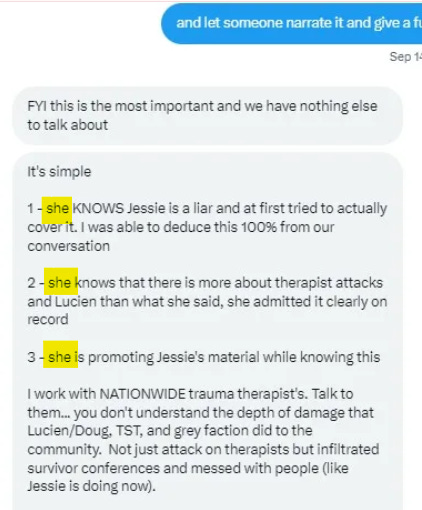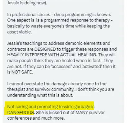 David’s issue with this appears to be spurious. David had falsely framed Jessie as being “HAPPY about legitimate therapists being infiltrated”. David continually deliberately misrepresents the truth. The whole point was that they were compromised therapists, so David is inverting the truth in his desire to attack Jessie. Jessie was happy to expose compromised therapists who had abused her mother, or been at the centre where she had been abused, which is far from the propaganda and lies that David was spouting.