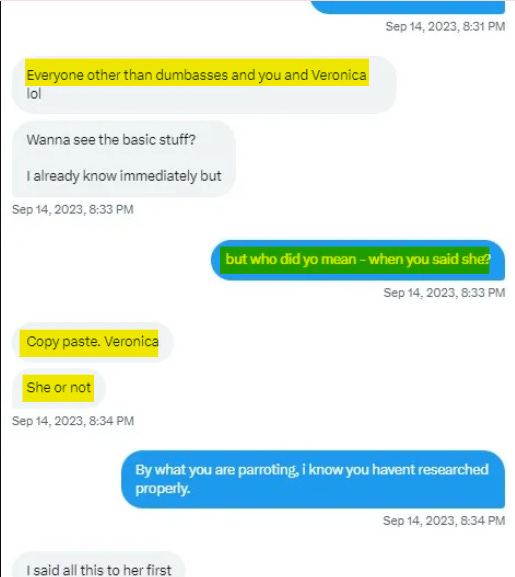 I did not know at this stage that Veronica had just blocked him. This day, Sept 14, was the start of David’s campaign against her, on twitter and with me in private messages. David had launched a PR offensive / psyop against her. He had been abusive to Veronica for some time, calling her names etc., in a similarly aggressive and confrontational way that he had been with me. Veronica had apparently got fed up of this and blocked him which I can understand as his continual abuse is very wearing, and she released a list of some of his insults, [VSL1].