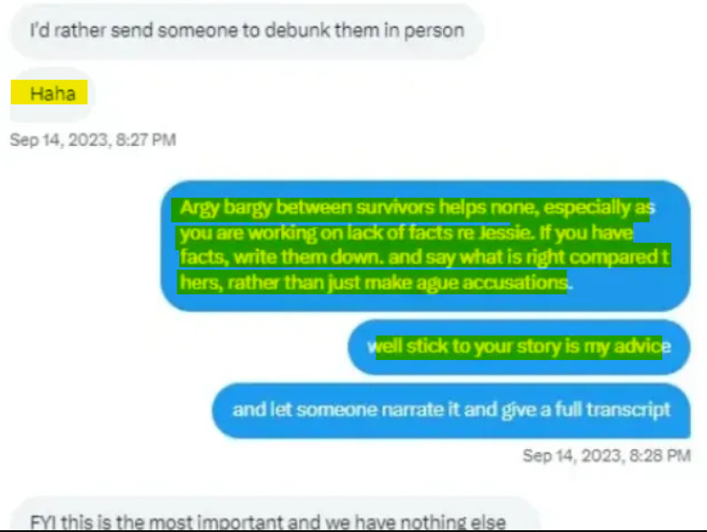 He then laughed at his own “debunk them in person” comment. I said that arguing between survivors helps no-one. I suggested that if he had facts, then he should write them down and to say what he thought was right compared to Jessie’s version instead of making vague accusations. I also advised him to stick to telling his own story.