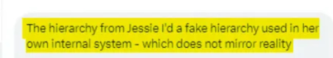 He claimed that is was just a mirror of her internal system. This is inaccurate as dealt with here, Grey Area Operator and System Structure [SSGM60]. David saying this was bizarre as the hierarchy structure was the same one that I had described in the post that he had said was very, very good!