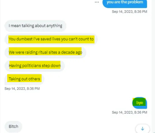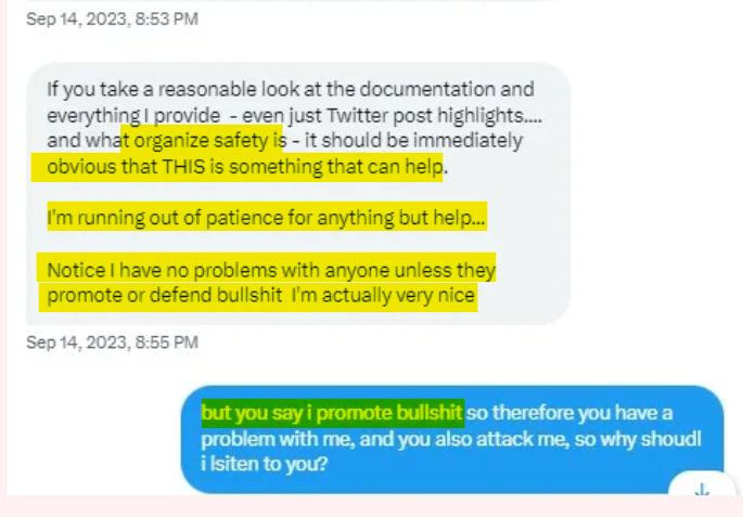 Abuse, Intimidation and Threats from Grey Area Monarch [SSGM33]. Grey tries to manipulate and control me. Some twitter DM’s. Told me I was lying to myself if I did not agree that Organize Safety was the solution.