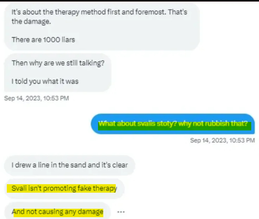 Perhaps he realised that he had said too much. He told me that he was in the middle of it, and then made ad hominem attack that I was “dense”. Of course he is in the middle of it, that was obvious to people who watch closely. Perhaps he should come clean on all his conflicts of interest. David should come clean on the ISSTD therapists role in his “deprogramming” / therapy and the ISSTD therapists role in Organize Safety. He should come clean about how he inverts the truth about Jessie wanting to expose compromised ISSTD therapists who were involved in a breeder centre, and why he portrays them as legitimate therapists.
