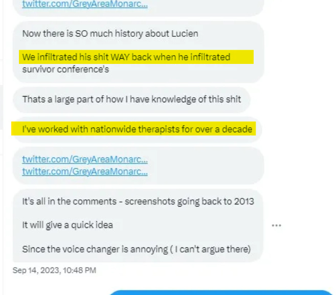 Lucien was Jessie’s childhood training partner in the system, and her personal protector. As well as that he became head of all protectors in the system at an early age. He or others via Grey Faction made a legitimate complaint to the American Psychological Association about Survivorship giving courses to the mental health professionals at conferences. The complaint was upheld and they were no longer being able to give those courses. The complaint followed the rules, as did the APA. It also had knock on consequences for ISSTD as they were circumventing the rules by offering courses with changed names.