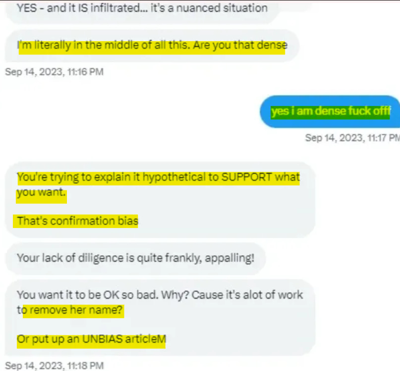 It appear to cause him to verbally stumble, as he uttered a nonsense statement about me trying to “explain it hypothetical [sic] to support what you want” . He then accused me of confirmation bias which didn’t seem relevant to anything. I wasn’t talking hypothetically, I was talking about real examples. It appeared to be a desperate attempt by David to gaslight me. But then he was straight back to trying to pressure me to remove Jessie’s name, or put up what he called an unbiased article, which of course in Davidspeak is an article that says what he wanted me to say!