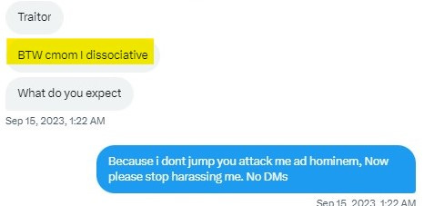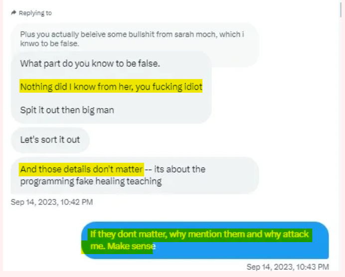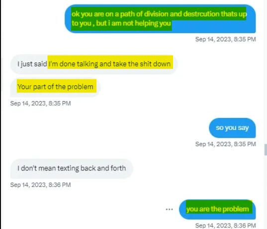 This was him starting to twist /reframe the conversation, trying to salvage something for him to be able to use. I can imagine David has already shown people those phrases and said that he gave me the chance and that I refused, as part of his gossip propaganda / framing that he engages with in private to convince gullible people and his flying monkeys.