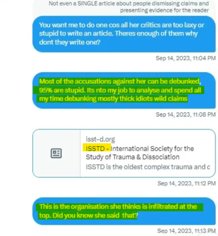 David had to admit that ISSTD was infiltrated, but claimed it was nuanced. So David for all his bluster and simplification trying to convince people that ISSTD / therapists were good and Jessie bad, he now actually confirmed that ISSTD was infiltrated, confirming what Jessie had said!