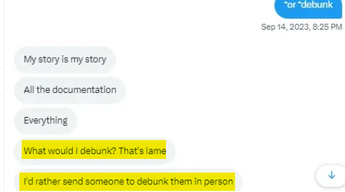 Despite clearly trying to diss others stories, he claimed debunking was lame and that he would rather debunk them in person, which appeared to be a threat.