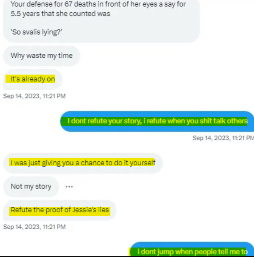 He claimed again in this last exchange that he was “just giving me the chance to… refute the proof of Jessie’s lies”.