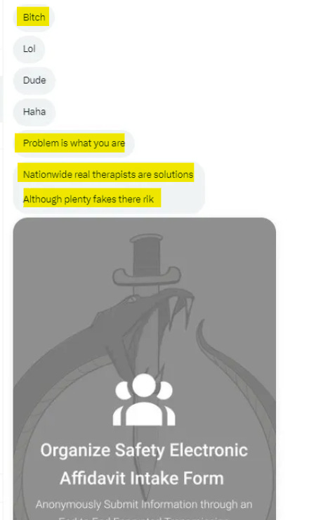 He told me again that I was a problem and he suggested that nationwide real therapists are the answer. He then admitted that there are plenty of fakes. He appeared to be alluding to ISSTD - who are the nationwide and international therapist organisation. He attached his Organize Safety logo, seemingly linking ISSTD to Organize Safety.