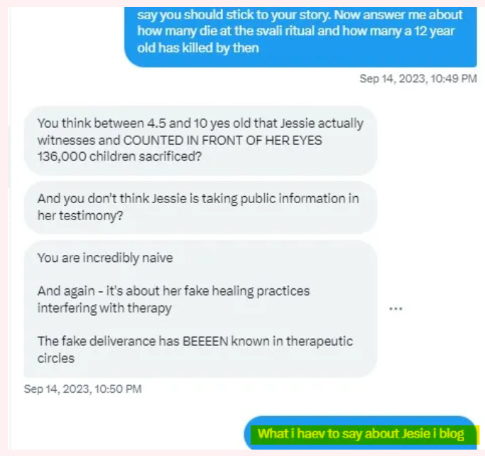 He again wanted me to refute what he called Jessie’s lies. Note he accused me of confirmation bias, but it is David who has the bias. even in the very question itself. I never tried to refute anything. I had a boundary to not talk about Jessie, and I tried to keep to that. David was an early adopter of AI and before the vast majority had access he was using AI to write instant articles, as well as for his gang stalking sock puppet accounts. Perhaps that is why he would expect instant answers in a chat, but even then David would never accept any evidence against his viewpoint.
