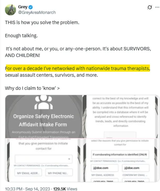 Straight after that comment he put his third link which was to a tweet of his dodgy Organize Safety group again. In that tweet David again says he has been working with the nationwide trauma therapists for a decade. Was the official relationship that he was a programmed subject being deprogrammed? Was it as a collector of information who would then go and lop heads off people? Were David and the therapists complicit in the violence and murders that his group committed? Is David defending compromised therapists?