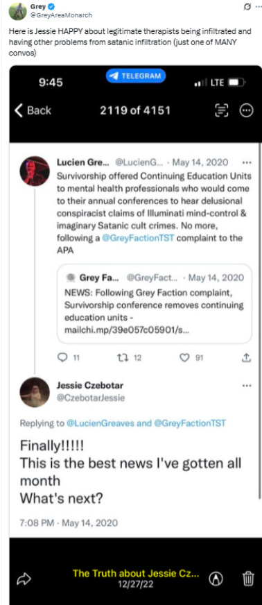 A full explanation would be too lengthy for this post but some essential context is needed which David deliberately does not give. Jessie has said that her mother was used as a breeder by the cult. When Jessie was at the breeder centre she saw people who became prominent ISSTD therapists. Another person that Jessie had seen at the breeder centre was Neil Brick. “Neil Brick who was part of the Breeder Program out of Cathedral of St Peters in Rockford IL where me and training partner were targeted in rituals with Aquino & Brennan, Soros, and Nazi Michael Karkoc”, [4]. Jessie also named Neil Brick as a Finder, [5]. Neil has for some time been at Survivorship, which was mentioned in Lucien’s tweet. David misses out all this essential context, intent on his own propaganda. He does not want people to know the facts, the truth, he just wants people to accept his narrative.