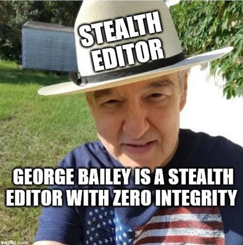 Bailey made insinuations that Jessie and I were the same person, then edited them out by stealth edit without noting the fact, George Bailey - Dishonest Stealth Editor [SSBB21].