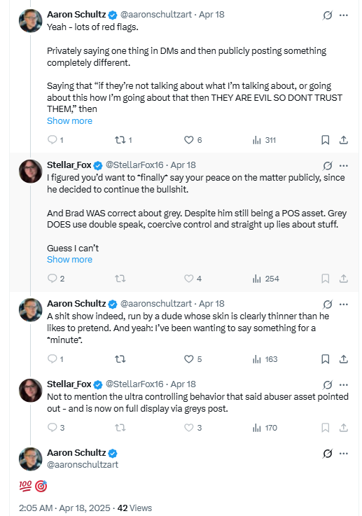 After the mid March fall out between StellarFox16 and GreyAreaMonarch it went quiet for a month but then Grey Area started up the feud again in mid April on twitterX. First some notes on how this is written.