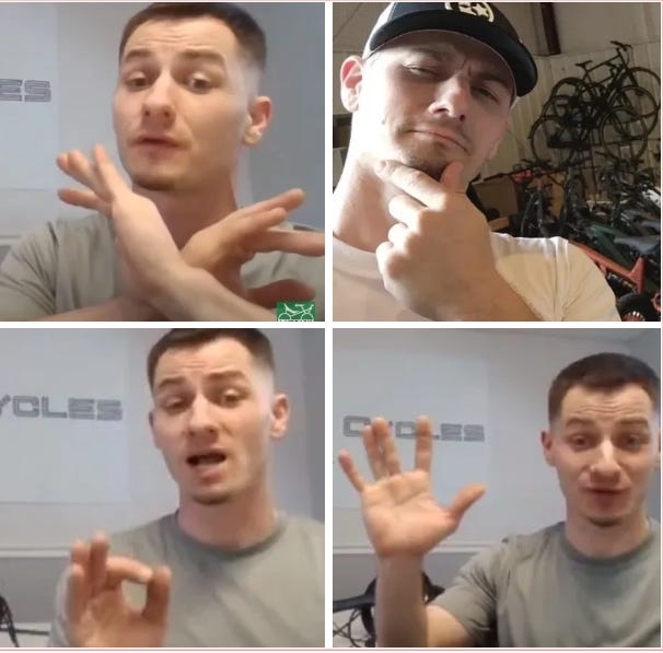 What are the chances of Grey doing 4 masonic hand signals by accident? 3 signals within minutes of each other on one video, and all 4 signals were in connection with his bike business?