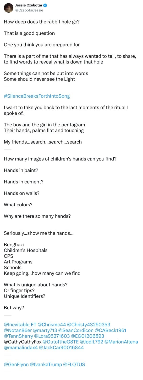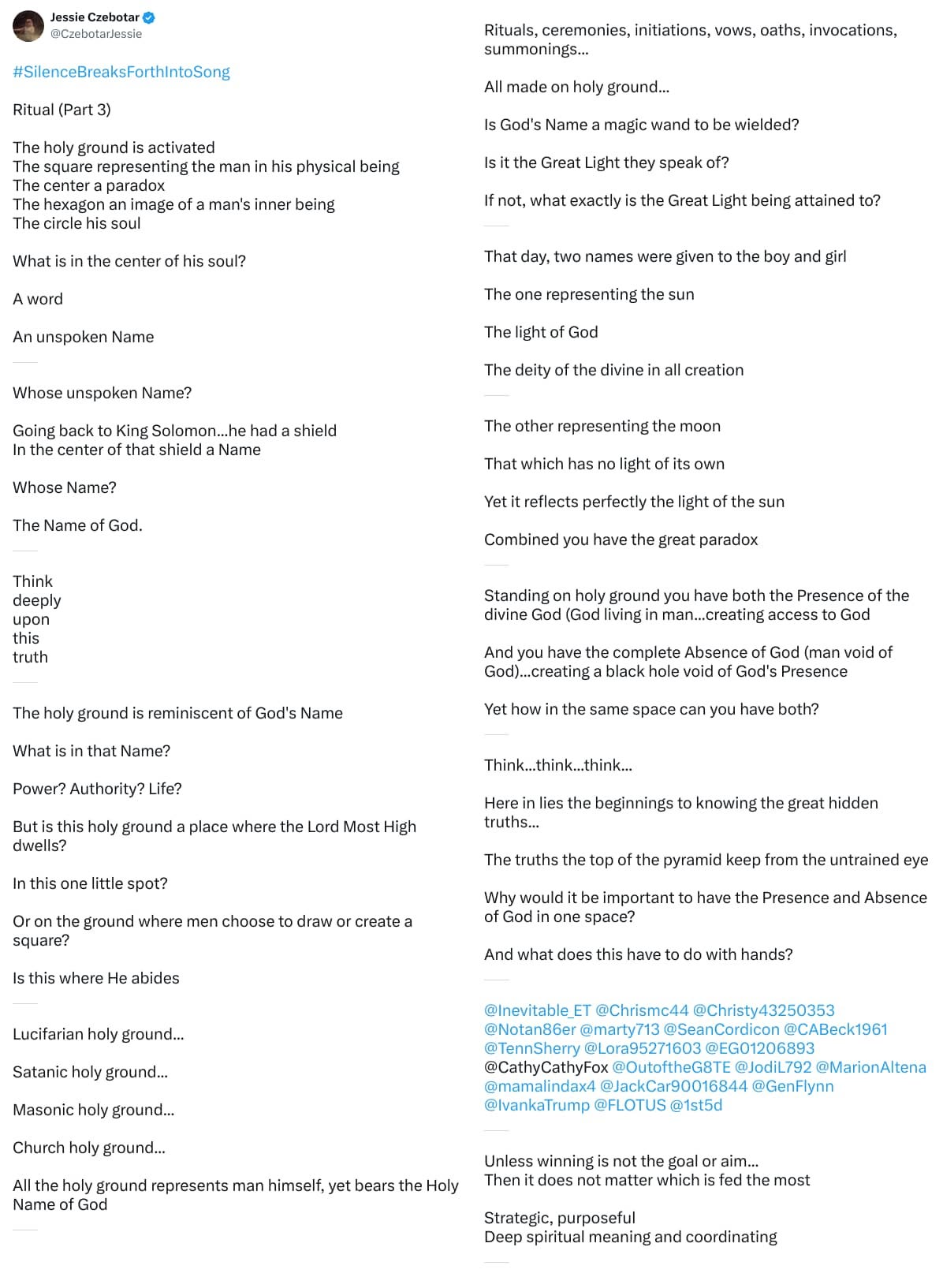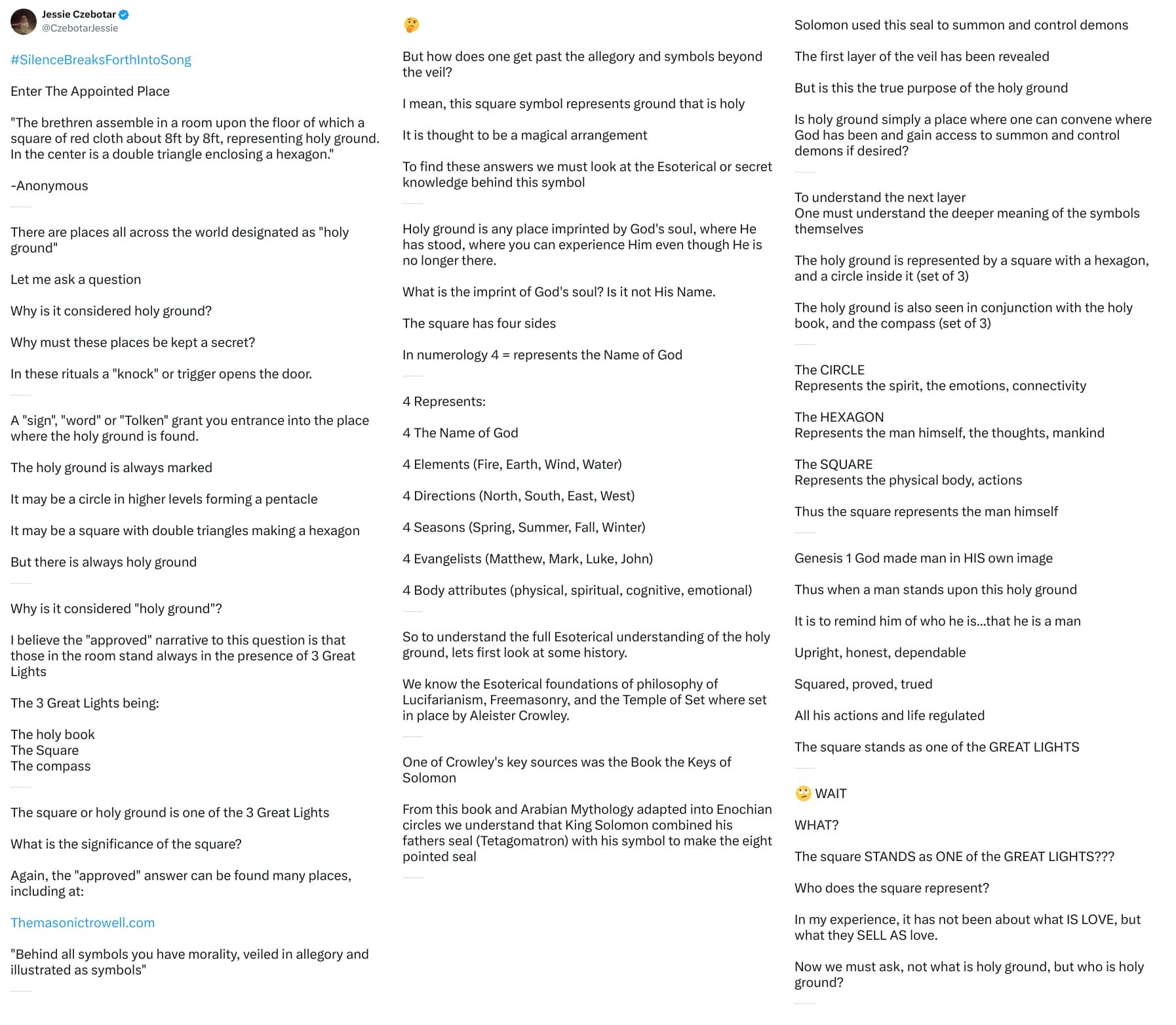 This current post is essentially showing all the tweets from the first 12 of Jessie’s threads, covered at the time in this post Silence Breaks Forth Into Song (SBFIS Part 1) [101] Threads 1-12.