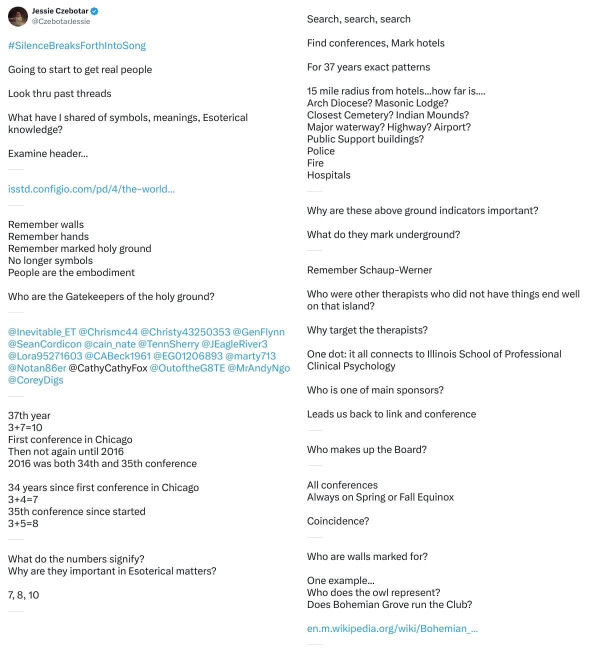 Threads 1-12 were originally covered in blog post Silence Breaks Forth Into Song (SBFIS Part 1) [101]. After I had caught up with those 12 threads, there were less threads in each post. I also added a Part 0, and Jessie wanted the Montauk posted included.