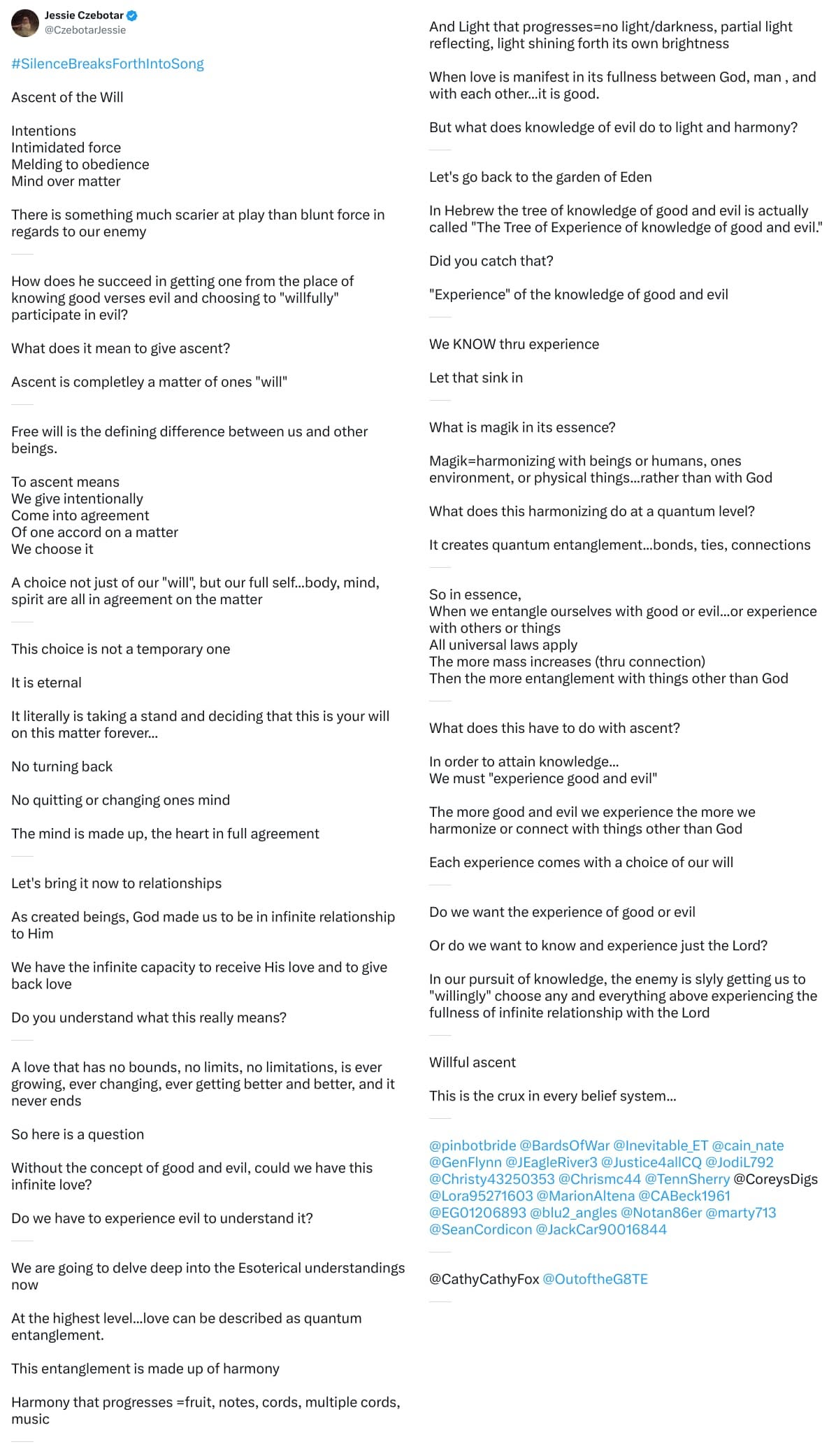 Jessie's "Silence Breaks Forth Into Song" Threads 1-12 Summary