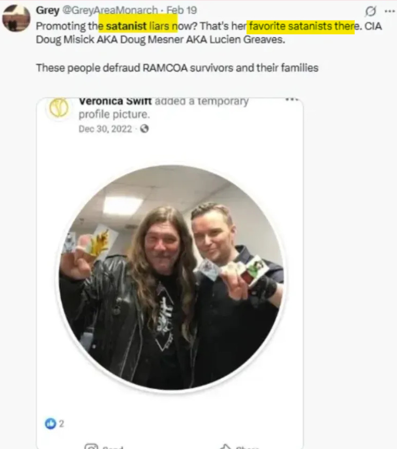 Grey Operator called Lucien Greaves and Lanzifer Longinus “her favorite satanists”, and this rhetoric was attached to a screenshot that Veronica had posted on her facebook. Grey claims that she is promoting the satanists and his comment about defrauding survivors and their families was worded to appear as though it included Veronica.