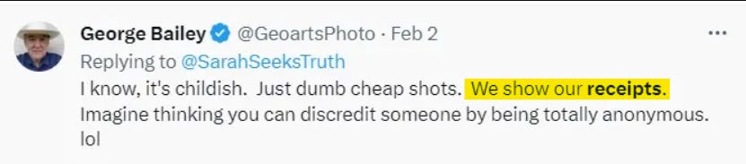 There are already many posts that show his lack of receipts, try the Bailey’s psyop posts and the fairly recent post on Cisco Wheeler [SSASH6].